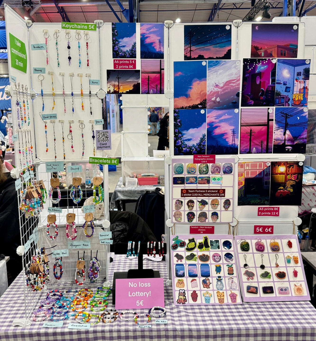 I have been participating in Artist Alley since 2023. My first convention was J Tsoon (Estonia), then I participated in Animatsuri (Estonia), Pumpkin Fest (Estonia), Unicon (Latvia), Creative Oasis Market (Latvia), Närcon (Sweden), and Comic Con Baltics (Lithuania).